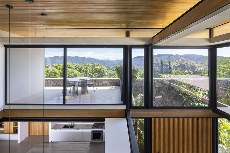 El logro de esta residencia radica en la forma en cómo equilibra la construcción robusta y a la vez ligera. Una estructura que se posa de manera casi efímera sobre un punto alto de la montaña y proporciona vistas inspiradoras de los alrededores naturales, ofreciendo la sensación de estar totalmente inmerso en ella. El diseño de esta casa se distingue por la sobriedad y limpieza de sus líneas, que hacen hincapié en su ligereza y robustez a la vez, y generan un perspicaz diálogo visual con el entorno natural. La arquitectura consigue establecer una conexión holística y profunda con la naturaleza, de modo que la línea entre el espacio interior y la majestuosidad exterior se desvanece en un flujo continuo de belleza y confort.
