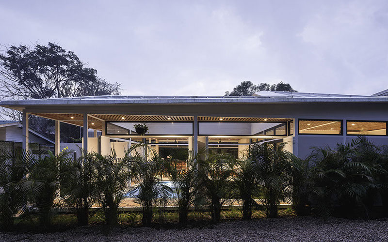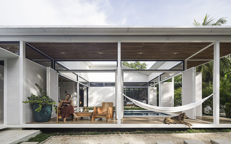 El diseño de Casa Jícaro se combina audazmente a través de un patio descentrado y con una plataforma flotante. no solo ha conquistado las limitaciones del terreno, sino que ha creado un oasis privado a la sombra de una majestuosa cubierta que beneficia el entorno ecológico